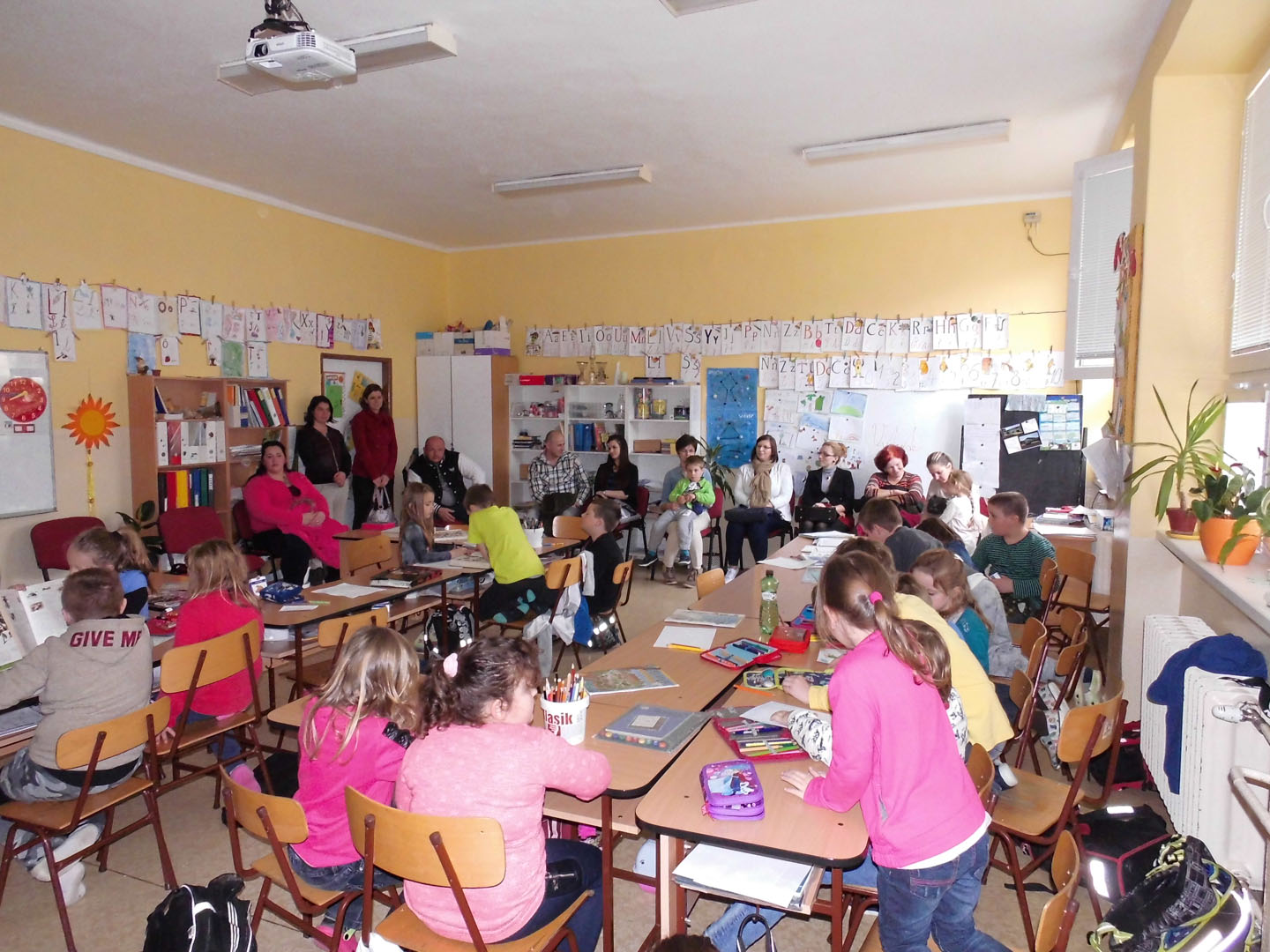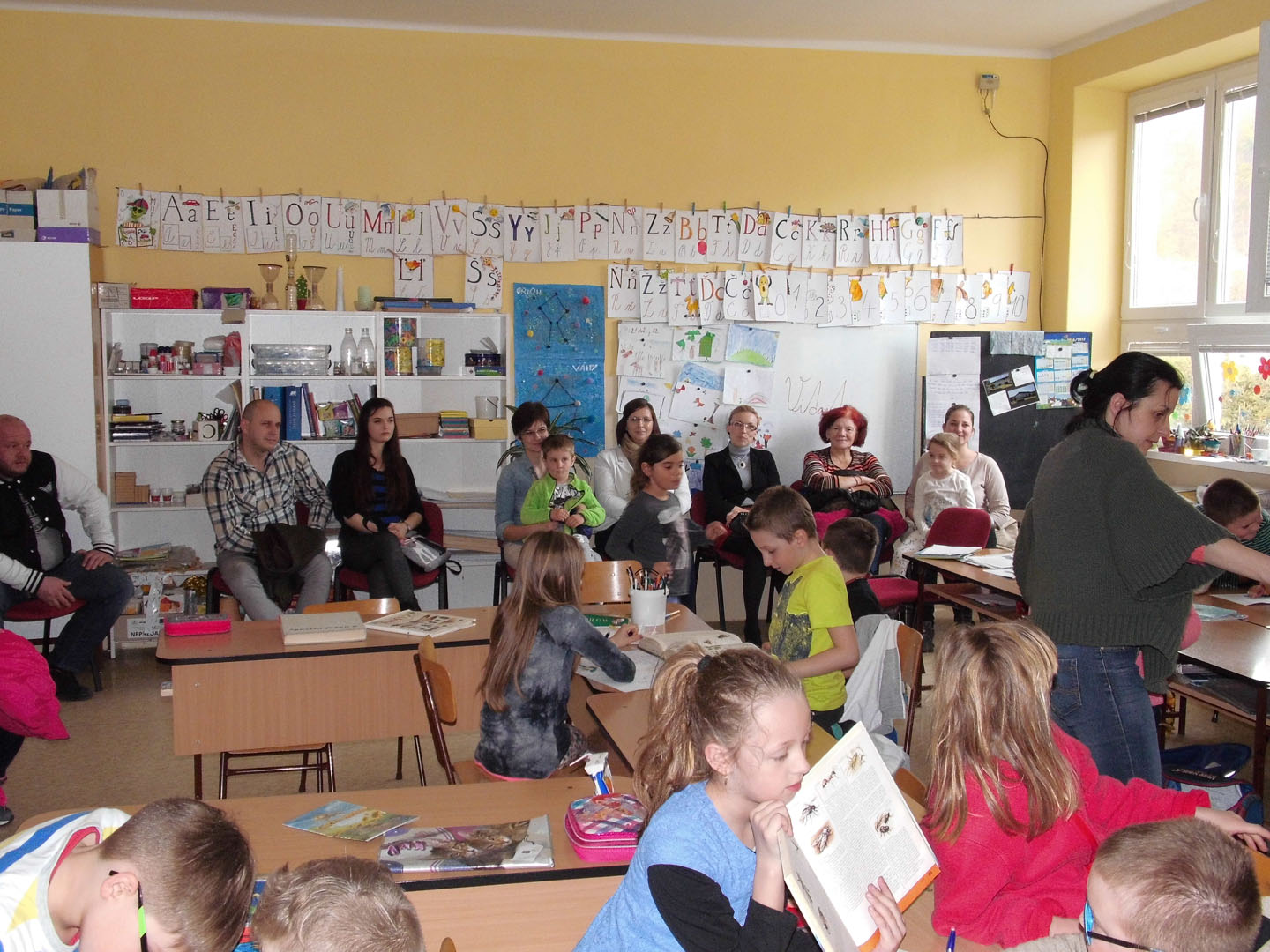 Vyučovanie sme posunuli na popoludňajšie hodiny, aby tí, ktorí mali záujem prísť sa pozrieť, nemuseli odísť z práce skôr. Začali sme o 12.00 hod., prvou hodinou, slovenským jazykom a písaním. Počas prvej hodiny mali žiaci chvíľu stres z prítomnosti iných dospelých na vyučovaní, ale prekonali ho veľmi rýchlo. Pracovali ako včely, aby všetci videli, čo už vedia. Druhá hodina bola matematika a veru, pohľady niektorých rodičov počas matematickej rozcvičky ukázali kto a ako často pri počítaní s dvojcifernými číslami používa kalkulačku... Na čítaní prváci ukázali, ako pekne už spájajú písmená do slov a viet a že to, čoho sa báli na začiatku školského roka (hlavne rodičia ☺) vôbec nie je až taký problém. Posledná, štvrtá hodina, bola prvouka. Druháci prezentovali svoje projekty o hospodárskych zvieratách a po prezentácii pracovali oba ročníky v skupinách. Druháci tvorili plagát o spoločenstvách hmyzu a prváci vyrábali triedny kalendár. Žiaci celé vyučovanie, hoci poobede, zvládli na výbornú. Za ich pozornosť a trpezlivosť im veľmi ďakujem.