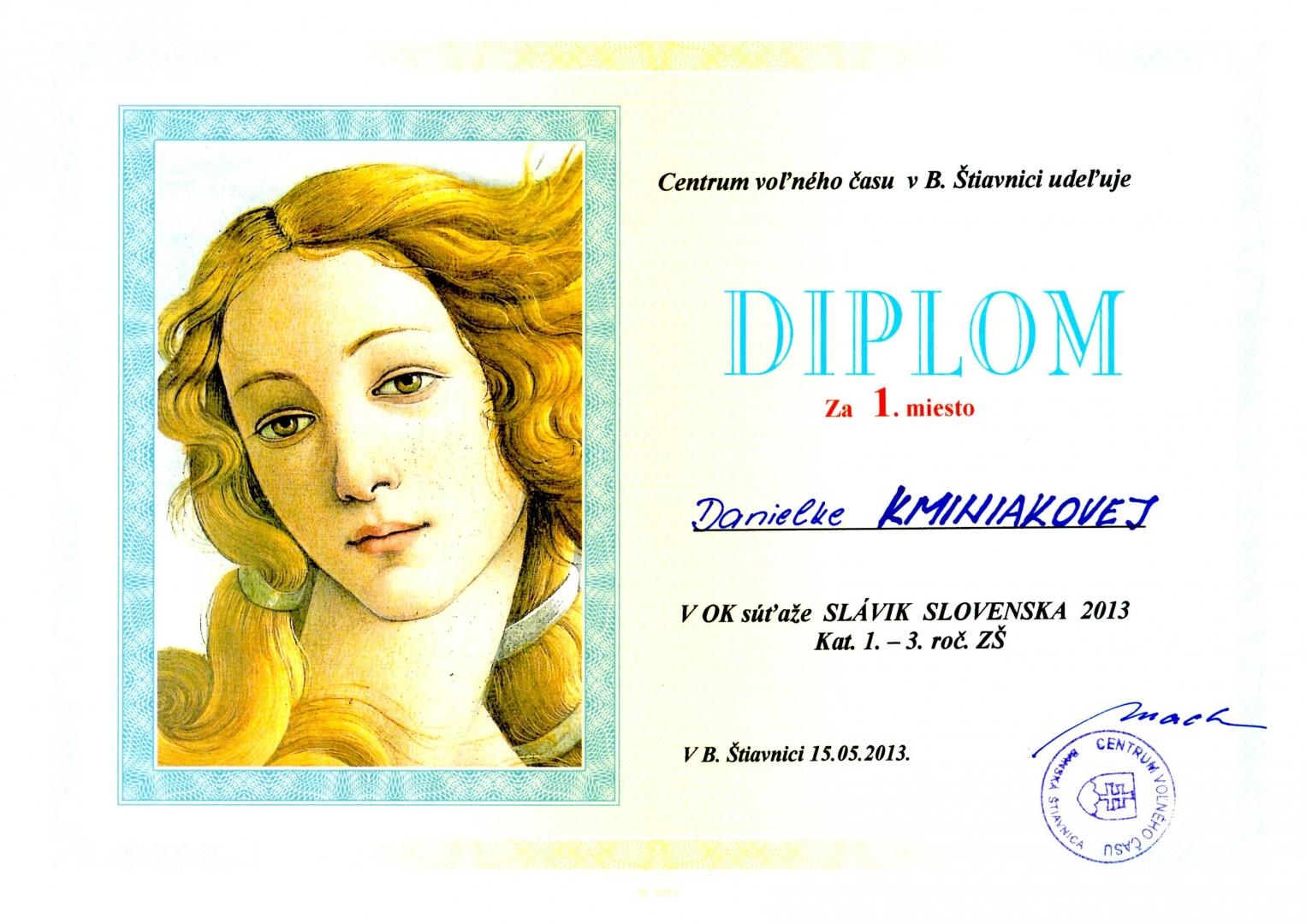 Dňa 15. mája 2013 sa v Banskej Štiavnici konalo okresné kolo speváckej súťaže Slávik Slovenska. Súťaž je zameraná na ľudovú pieseň, má dlhoročnú tradíciu a prísne kritériá. Súťažiaci musia spievať dve piesne, z toho jednu povinnú, druhú z regiónu, jednu s doprovodom folklórneho hudobného nástroja, jednu pomalú a jednu rýchlu. Prihliada sa aj na úpravu zovňajšku. Aj napriek tomu sa každý rok zúšastňuje Slávika stále viacej detí a v jednej kategórii ich toho roku bolo dokonca 15. Veľkým úspechom našej školy je prvé miesto Danielky Kminiakovej a pochvala poroty pre Milana Horvátha a Timeu Koreňovú. Danielku sprevádzal na heligónke jej otec Martin Kminiak a Timu s Milanom sprevádzala na akordeóne pani učiteľka Knezovičová. V krajskom kole držíme Danielke palce.
